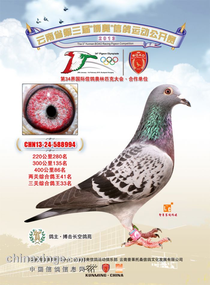 2013云南博奥决赛获奖鸽,原定于12月15日举行的决赛,因为天气有变而不得不改为19号,这一天气突变却变为了全云南省十年一遇的大雪。谁也没想到,这一场比赛变为了艰难的——“雪鸟”大赛。 上笼一千多羽,当天归巢不足百羽。994最终获得84名,指定1000元组10名。