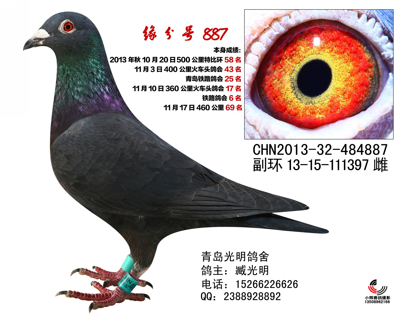 缘分号直孙:(红狐*桑杰士) 本身成绩: 2013年秋:10月20日 500公里特比环58名 11月3日400公里火车头鸽会43名 青岛铁路鸽会25名 11月10日360公里火车头鸽会17名 铁路鸽会6名 11月17日460公里69名