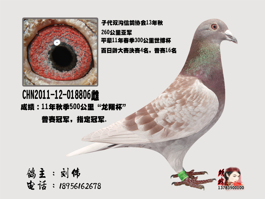 11年秋季500公里“龙翔杯”普赛冠军,指定冠军。 子代双沟信鸽协会13年秋260公里亚军。 平辈11年春季300公里世博杯百日龄大赛决赛4名,普赛16名。