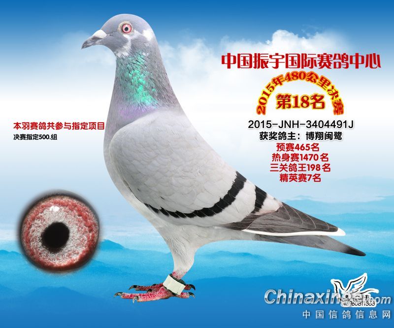 | 港龙鸽舍:15年送温州振宇公棚参赛鸽9羽(其中3羽由平阳鸽友搭送),此2羽兄妹获奖鸽平辈共送2窝4羽,公棚家飞游棚2窝各1羽。经多站训放后于12月4日踏上预赛征程,由于预赛当日 福建浙江沿海大雾天气致使上笼3209羽单日仅归巢397羽,第2天归巢108羽,第3天归巢138羽,3日内仅归巢643羽,此2羽兄妹鸽分获206名与465名。895羽预赛归巢精英(据很多鸽友反映,其中有200来羽比赛鸽是被福建鸽友网住的预赛迷失鸽由公棚参赛鸽友以 2000-3000元人民币赎回并送回公棚旁边放归的)于12月17日晨6:50在福建漳州空距464.2公里决赛放飞,下午1:38隔窝妹妹环号2015-JNH-3404491归巢勇夺18名(仅与冠军 相差1分53秒),意想不到头窝兄长环号2015-11-0209981也于33分钟后归巢获198名。参赛公棚十数载,后奖连年不断,像这次兄妹双双归巢获奖是本人赛鸽生涯中难得的里程碑!(兄妹以0.6万与1.8万元竞拍回棚以资鼓励) |