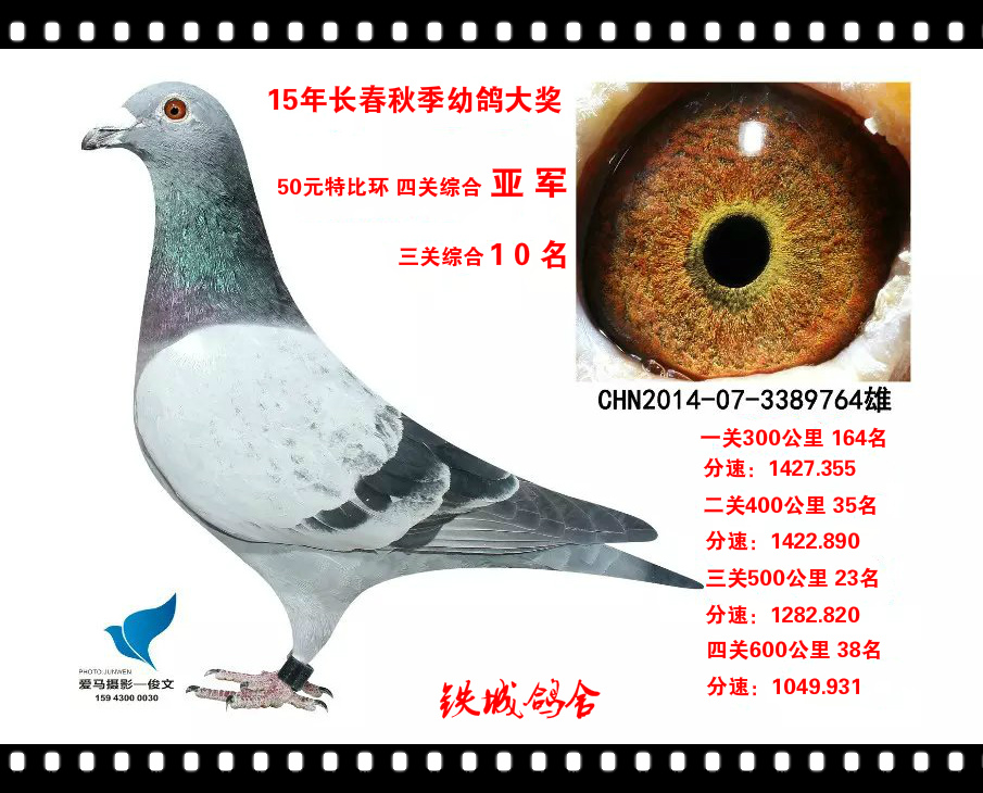 764号,是4月15日出生,在秋季第一300公里比赛时,中弹、艰难飞归。归巢后发现764右眼下方有颗气枪铅弹,经过强洗伤口,消毒后,右眼眼砂明显腿色,由亮黄眼变为暗黄色。经过休息5天后,带伤再次登上400公里战场,取得35名,顽强的764带伤飞完,全部关赛,500公里获23名,600公里获38名。四关综合亚军。