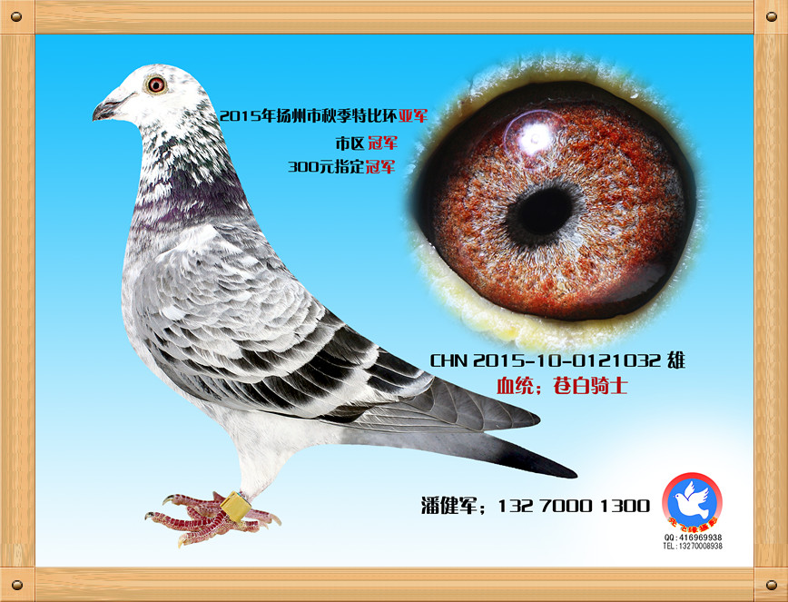 | 扬州潘建军:今年秋季严重雾霾天气,给市民出行、信鸽比赛带来了很大的影响。扬州市幼鸽特比环比赛于2015年11月14日在河南泌阳放飞、一路地区也遭遇阴天、严重雾霾,能见度仅有500米的恶劣天气下,在全国公棚和地方协会,比赛都非常不理想的状况中,本棚赛鸽顽强拼搏、强力奋飞,当天归巢5羽,全部进奖,第二天归巢一羽(共参赛7羽,都是300元指定环),扬州市秋季幼鸽特比环550公里大奖赛,司放羽数:6351羽,此鸽获得扬州地区总亚军,市区冠军,300元指定冠军