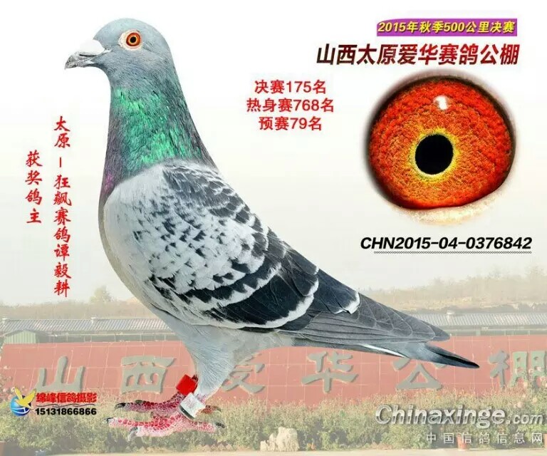 此鸽父亲来自江苏赛鸽强豪莫秋林先生,母亲是包头赛鸽高手金马鸽舍马悦先生。一五年春季首次配对即出两羽公棚奖鸽。另一羽平遥鸿翔公棚预赛四十五,决赛二十一。综合十一。在此感谢各位对本舍的大力支持