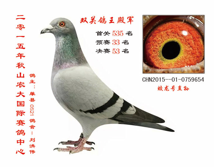 山东山农大秋棚预赛33名决赛53名,双关鸽王殿军。蛟龙号直孙