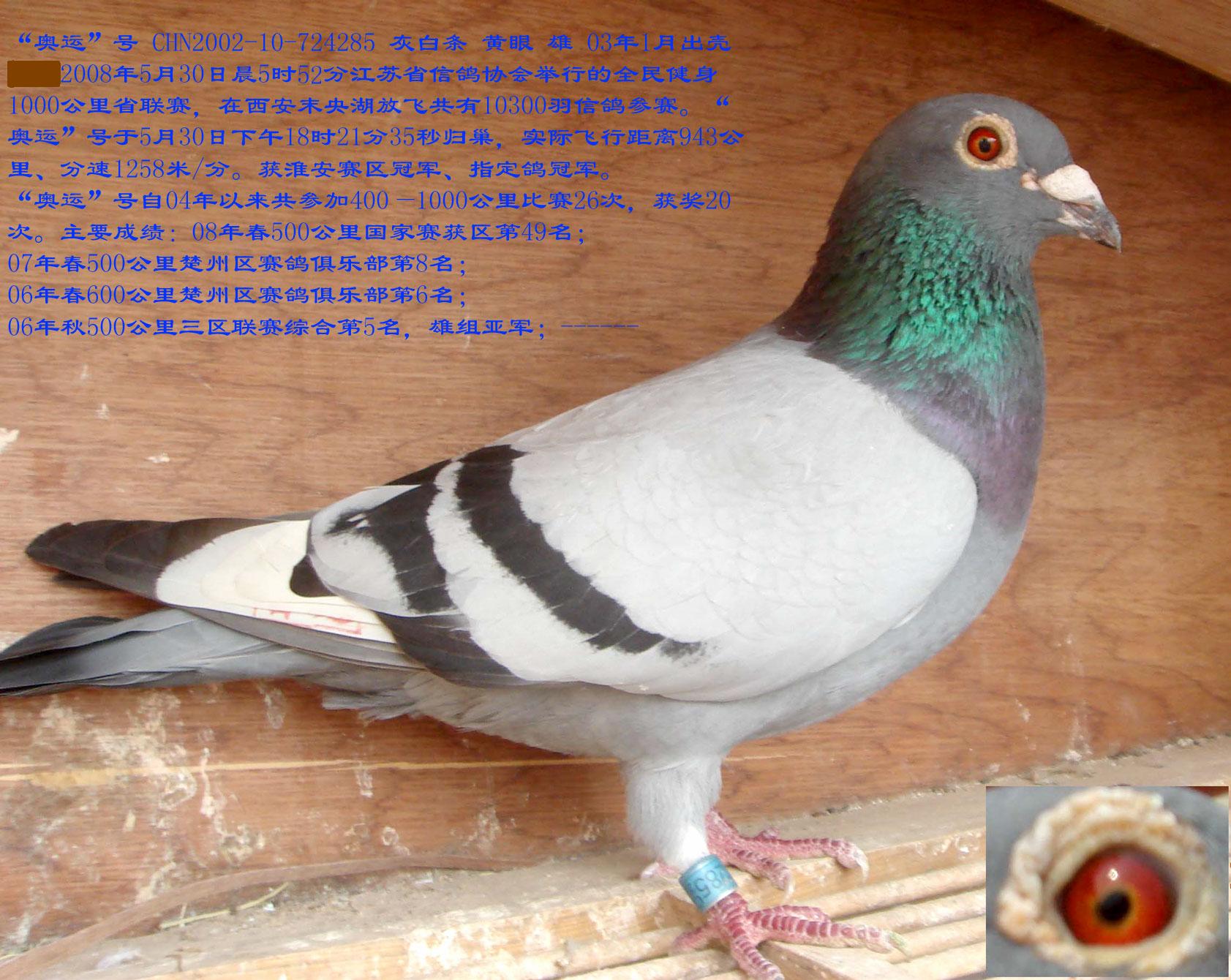 2008年5月30日晨5时52分江苏省信鸽协会举行的全民健身1000公里省联翔,来自苏州、南通、连云港、徐州、宿迁、盐城、泰州、镇江、扬州、淮安、常州、南铁·银鹰、无锡等十四个省辖市和行业鸽协共有赛鸽10300羽在西安末央湖放飞。本棚选送的“奥运”号于5月30日下午18时21分35秒归巢,实际飞行距离943公里,分速1258米/分;获淮安赛区冠军、指定鸽冠军。“奥运”号归巢后的图片