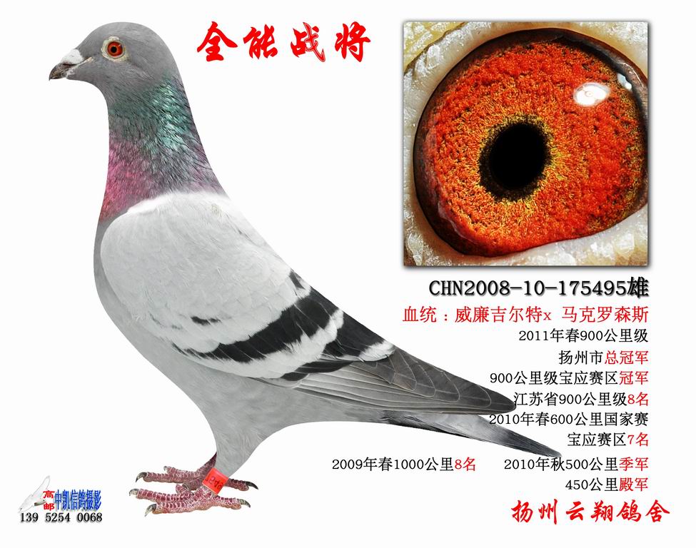 全能战将:一羽超级种赛鸽,从300公里-1000公里全力出击:300公里8名,500公里季军、殿军、12名、600公里7名、第一次1000公里8名、第二次1000公里归巢、第三次1000公里省联赛(900公里级)市冠军、县冠军、江苏省8名、、、超级遗传直子获500公里5名、特比环4名、1000公里19名、57名精彩不断、、、、