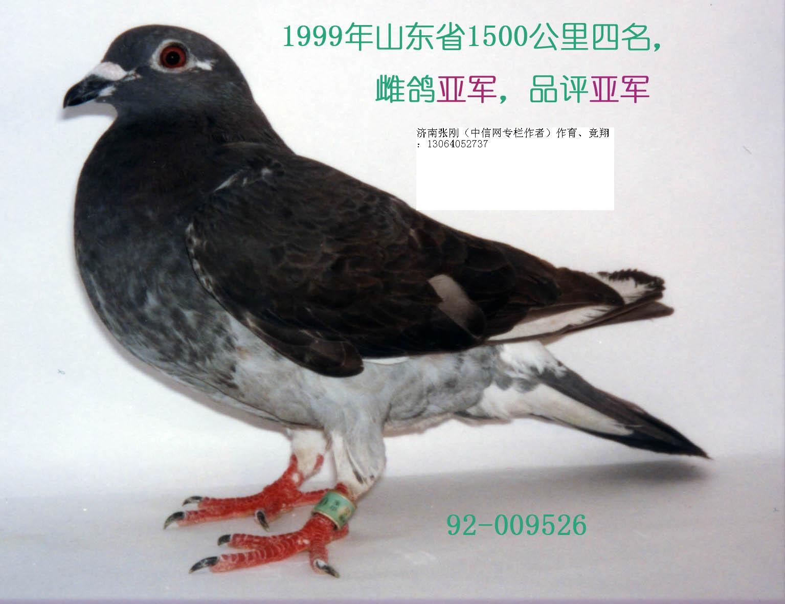 济南市1999年1500公里第四名,同时山东省1500公里第四名,雌鸽亚军、品评亚军。12天(那年报到期山东省一共归巢4羽,天气不好)500公里直接放飞1500公里。
