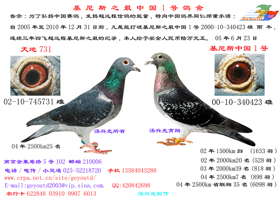 汤兴光 在信鸽杂志上 网络上 作广告承诺 从2005年至2010年12月,能打破该鸽三年四飞超远程赛绩 奖励人民币六万元. qq420842698 qq 735579504 geyoutd2003@sohu.com