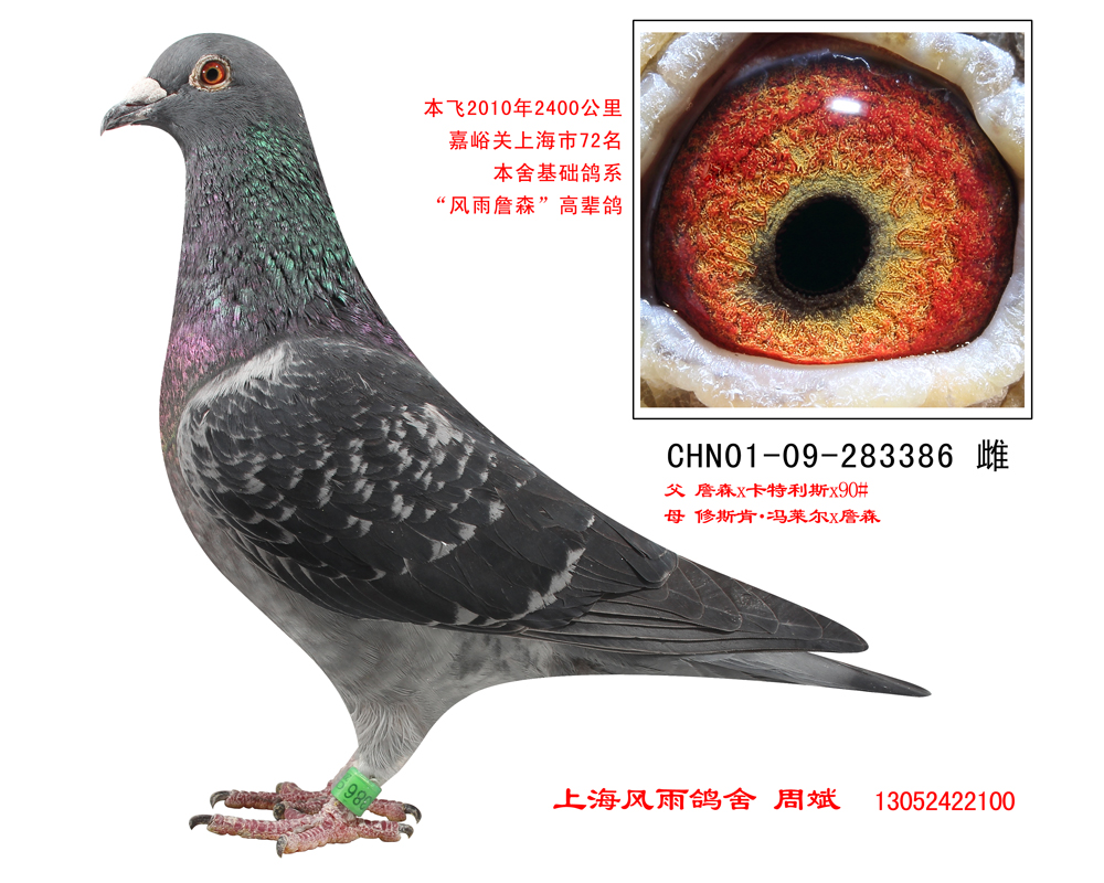 上海市2010年春嘉峪关2300公里72名,雨点 黄眼 雌 风雨詹森 10年老雌竞技超远程,近照一点没有老态,年轻时曾作出江苏泰州姜堰1000公里指定鸽冠军,全弟今年又作出江苏国家赛700公里姜堰冠军,季军! 家族内成绩无法一一列举,详见中信网展厅介绍“上海金裕鸽舍” 原名“上海风雨鸽舍”