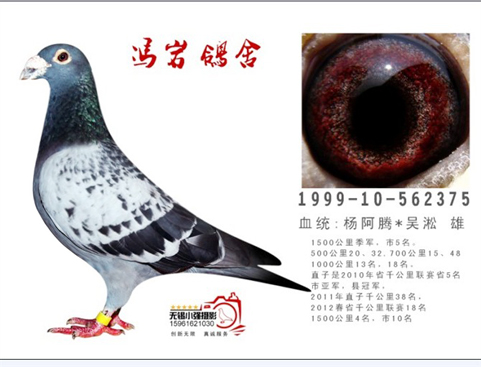 血统:杨尔腾*吴淞! 成绩:500公里20.32 700公里15.48 1000公里13.18.48.52.... 1500公里季军。5名! 直子553963雄灰砂!2010江苏省千公里联赛900公里组省5名。市亚军。冠军! 直子2007-10-147203雨点11年春1500公里4名,10名!今天22号已经在兰州放飞开笼!希望能有好的表现!QQ交流158248742