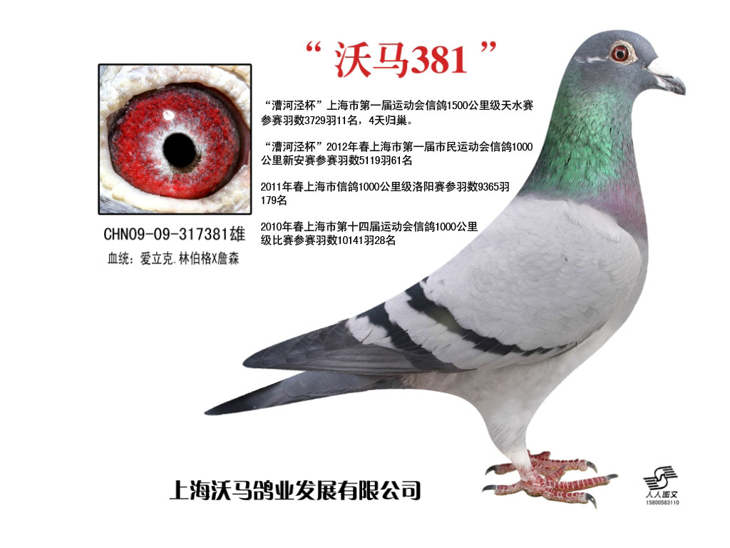 沃马鸽业:2010年春上海市第十四届运动会信鸽1000公里级比赛,参赛羽数:10141羽,28名,2011年春上海市信鸽1000公里级,参赛羽数9365羽, 179名,[漕河泾杯]2012 年春上海市第一届市民运动会信鸽1000公里新安赛,参赛羽数5119羽, 61名,[漕河泾杯]2012年春上海市市民运动会信鸽1500公里级天水赛,参赛羽数,3729羽, 11名,4天归巢.