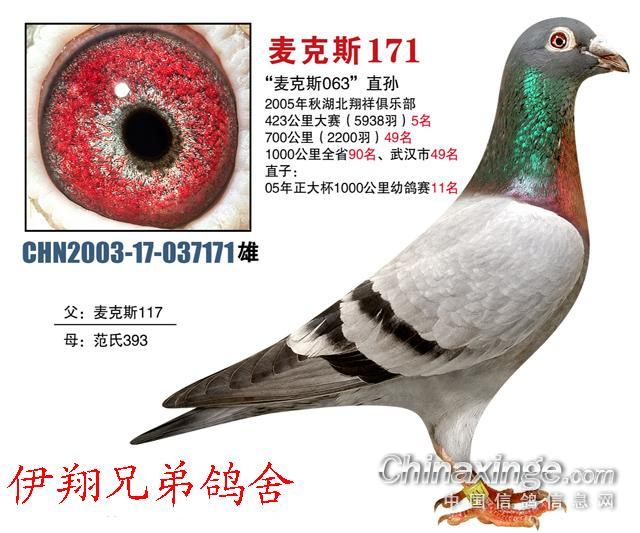 麦克斯171 “麦克斯063”直孙 2005年秋 北翔祥俱乐部 423公里大赛(5938羽)5名 700公里(2200羽)49名 1000公里湖北全省90名,武汉49名。直子: 05年正大杯1000公里11名。
