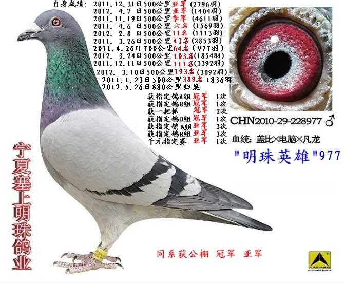 明珠英雄“977”此鸽自身成绩优秀,不比国外鸽子成绩差,在本舍继续参赛。此鸽是朋友赠送幼鸽。此鸽在比赛中为我争得了荣誉。为我争了一口气。 CHN-29-10-228977 成绩优秀 QQ303556322 电话李军 13895551441