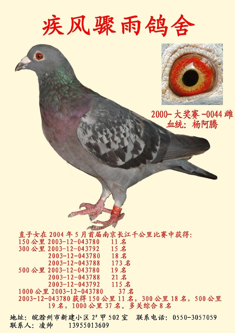 在2004年5月的首届南京长江千公里公棚比赛中,凌帅疾风骤雨鸽舍获得:&150公里&2003-12-043780&11名&300公里&2003-12-043792&15名&2003-12-043780&18名&500公里&2003-12-043780&19名&2003-12-043788&21名&1000公 里&2003-12-043780&37名&2003-12-043791&46名 2003-12-043780&获得150公里11名,&300公里18名,500公里获得19名,1000公里37名,多关综合8名,是长江公棚每站都得奖金的两只鸽之一 2003-12-043791获得300公里40名,500公里获得82名,1000公里46名。多关综合15名,此血统长江公棚同宗同族四只鸽,3只都拿了奖金,2003-12-043780&更是每站都得奖金&,&2003-12-043788&500公里&21名,差34秒未得奖金,壮志未筹。 |