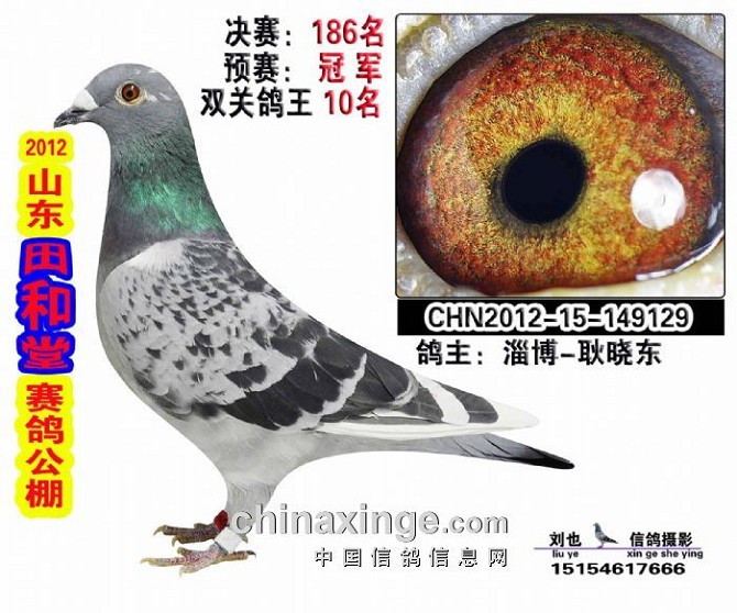2012年秋淄博田和堂赛鸽公棚预赛上笼2161羽爱鸽力挫群雄,勇夺冠军,决赛上笼1103羽,当天仅归13羽,创淄博公棚有史以来记录,哈哈,预赛冠军又用坚强的斗志证明了它的实力,勇夺186名,我觉得实属不易,为我的爱鸽感到自豪,鸽主淄博耿晓东。