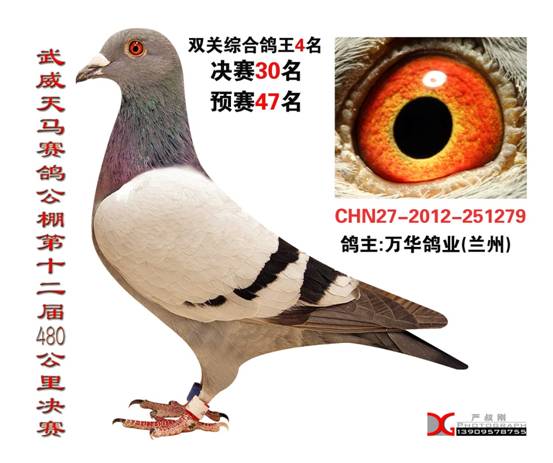 甘肃武威天马公棚决赛30名,双关鸽王4名,同父母上窝兄获地方大特比9名,总特比排名21名,千元3羽赛冠军,侄子同场29名,桑杰士配詹森,父母均为公棚获奖鸽,发挥以致5代啊,小阳台棚不容易啊,哈哈,甘肃金樽鸽业!!