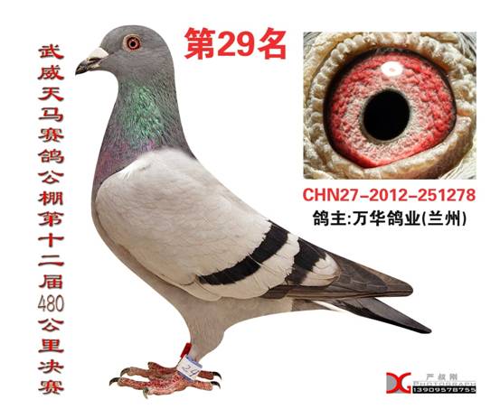 甘肃武威天马公棚决赛29位,同场叔叔获30位,鸽王4位,父母是桑杰士配乔斯托内,父母均为公棚获奖鸽,本系以发挥至5代啦,小阳台棚养鸽子真不容易啊,哈哈!甘肃金樽鸽业