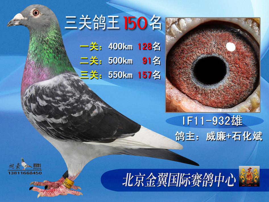 北京金翼团队。 总羽数2000羽。空距550公里决赛157名。三关鸽王150名。 2011-IF-932 雨白条.雄.砂 本身成绩 美国名家威廉杨做育。由威廉杨+石化斌选送北京金翼团队。本身成绩三关鸽王150名!血统:桑杰士.父亲.威廉冠军血系。母亲.本身六次获奖,冠军.一次,前十.五次【参赛费5000元】