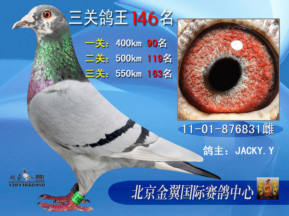 北京金翼团队。 总羽数2000羽。空距550公里决赛163名。三关鸽王146名。 2011-01-876831灰白条.砂.雌.美国威廉杨先生做育。美国威廉杨先生选送金翼团队三关鸽王146名!血统;山普森X桑杰士.父亲;全美冠军.母亲;本身500公里冠军600公里12名.【参赛费5000元】同窝876832飞金翼团队三关鸽王176名。