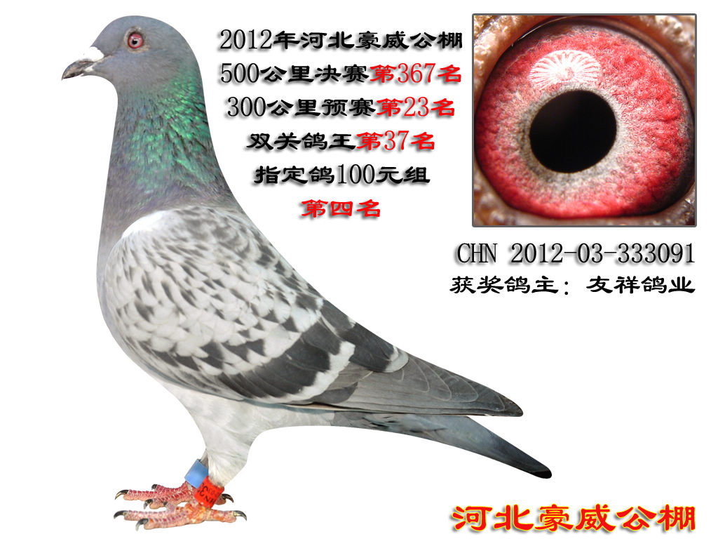 河北豪威公棚。 总羽数989羽。空距500公里决赛367名。双关鸽王37名。 2012.03.333091雨点.砂眼.雌鸽. 河北名家友祥鸽业做育。河北名家友祥鸽业选送预赛23名.决赛367名.双关鸽王37名。友祥提供血统:父.影视公棚决赛47名。母.05年波治鸽王冠军。