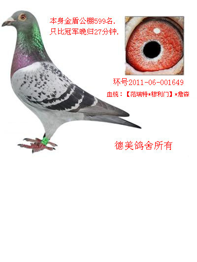 【德美英雄号】2011.06.001649 雨点 公 沙 血统 【100%詹森】*【范瑞特*穆力门】500公里与冠军就差27分钟.【德美鸽舍所有】直子获;12年科尔鈊公棚热身赛第3名.【455226】热身赛第70名.决赛308名.【455337】