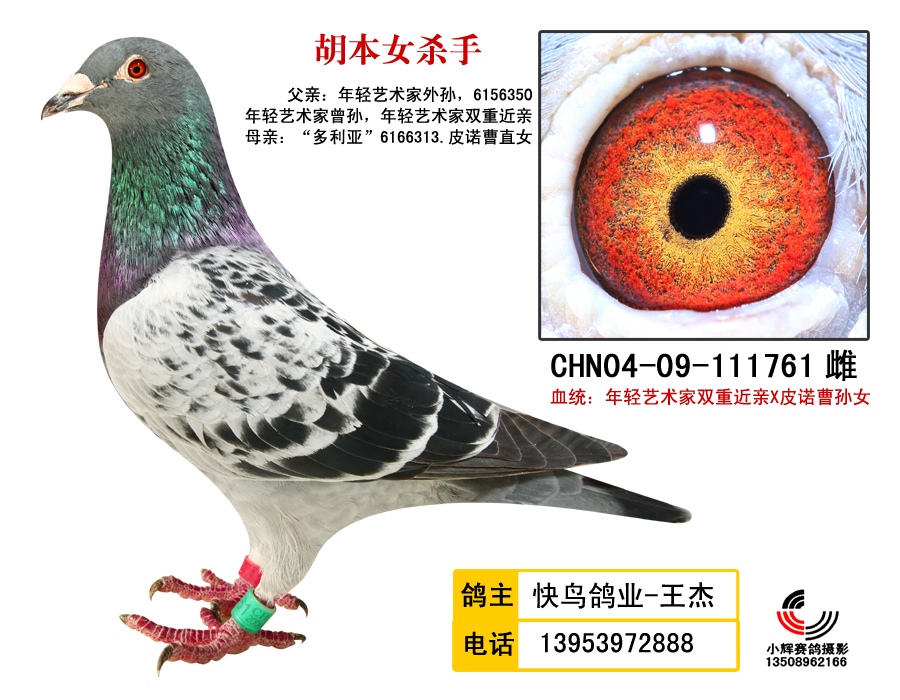 04-09-111761“女杀手”胡本,年轻艺术家双重近亲X皮诺曹孙女!父亲:6156350年轻艺术家外孙,年轻艺术家曾孙,年轻艺术家双重近亲!母亲:6166313“多利亚”皮诺曹直女!做出上海特比环南线一万多羽的28名,北线一万多羽特比环13名!做出临沂市51万特比环260公里的冠军,亚军。幼鸽速度赛的三关鸽王,冠军,沂蒙杯五关的鸽王,冠军等等!