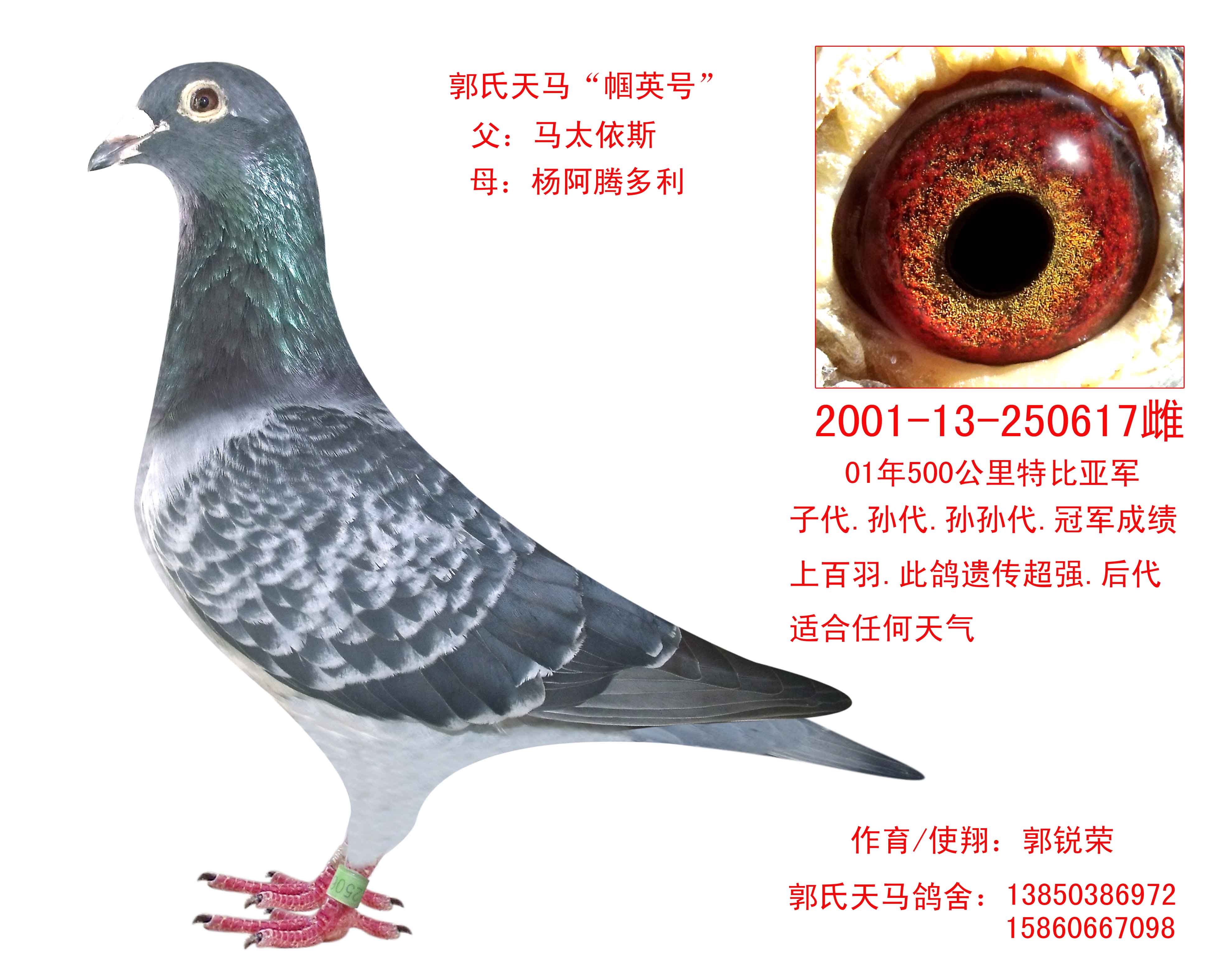 | 郭氏天马鸽舍:如果说大铭鸽,此鸽在10年后不知道称的上称不上。本身2001年500公里特比亚军,配对鸽舍里3羽基础雄 《恒得利 凡布利安娜 和萧山雄188 》到现在连续多代 冠军名次鸽在本舍上百羽。出售和支援给鸽友子代孙代孙孙代鸽,出冠军名次鸽也超过上百羽。此鸽特有超强遗传性,后代10年的比赛里,任何天气赛飞里都有入赏,特别是恶劣天里表现突出,有鸽到必到,没鸽到有的时候她的后代就到。足环:2001-13-250617 血统:马太依斯× 多利杨阿腾《福建郭氏天马鸽舍基础第一代种鸽》