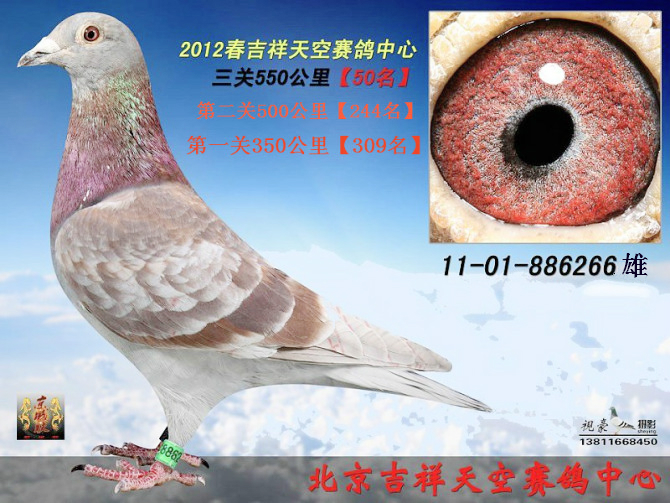 2012年春北京吉祥天空俱乐部。 总羽数1500羽。决赛550公里50名。 2011.01.886266雄鸽.砂.降 本身成绩 北京名家赵福水做育。由北京名家福运来赵福水选送北京吉祥天空俱乐部。!血统;詹森红狐.【此鸽特比环6000元】此鸽带奖状和相片