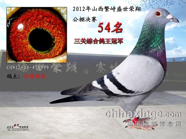本身2012年山西繁峙盛世荣翔公棚 180KM热身赛21名(参赛羽数:3507) 300KM预赛冠军(参赛羽数:3342) 500KM决赛54名(参赛羽数:2901) 三关综合鸽王冠军 获得各项奖金及指定共4万多元