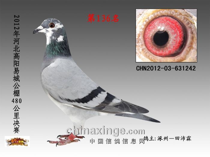 2012年河北易诚公棚预赛143名,决赛136名。血统父为卡普决赛16名直孙--同父母平辈2010年北京恒兴鸽王配2004年北京田德生胡本近亲子代。136名同父母鸽2010年河北诚信一关128,预赛61