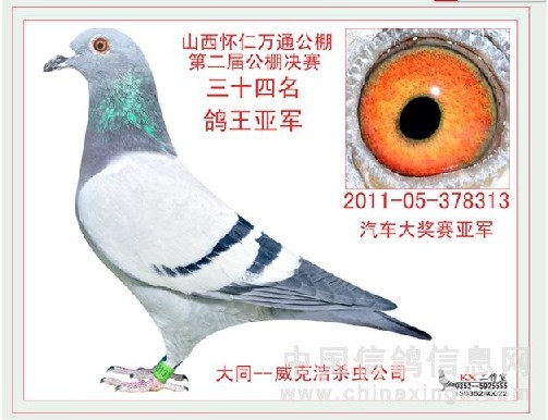 血统;胡本*电脑 获2011年山西万通公棚300公里25名, 500公里34名, 获:双关鸽王亚军,双关汽车大奖赛亚军(获汽车一辆)