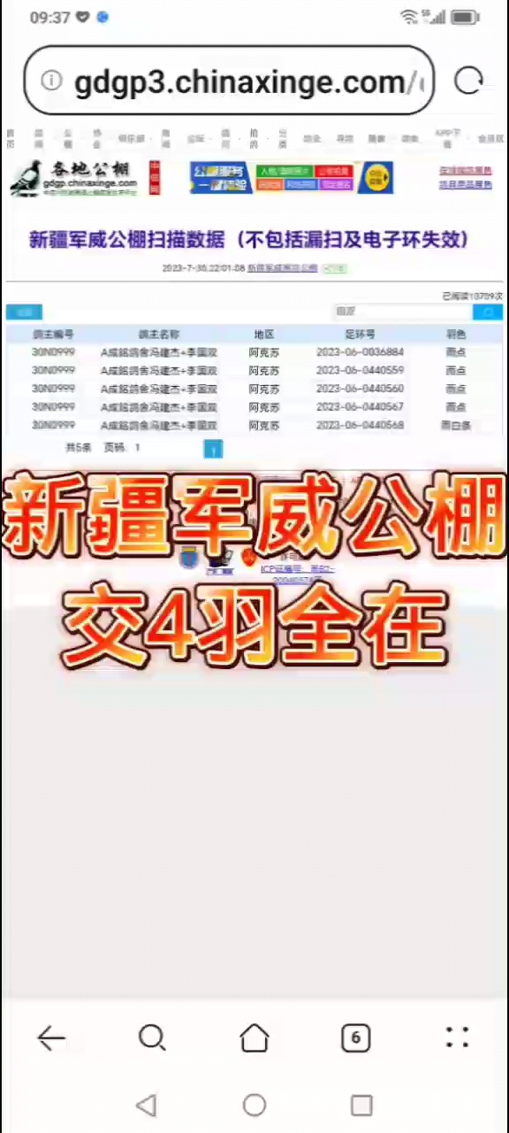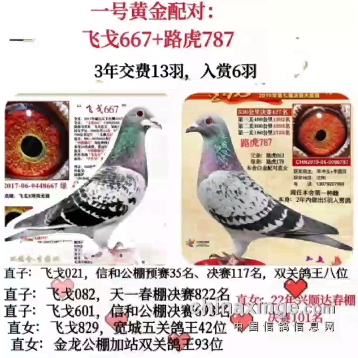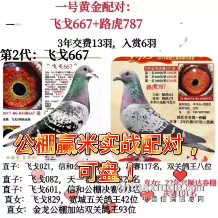 统一回复一下! 舍内的所有的鸽子,都可以转让,只售到公棚赢米的配对。 不是淘汰破烂,价格能接受可以电联。 一号黄金配对: 飞戈667x路虎787,3年出6羽奖鸽(儿子公棚预赛35名,决赛117名,双关鸽王八位。女儿春棚决赛101名)一对6W。 鸽王配对: 飞戈021x胡本006x加站86名,这个组合2年出3羽奖鸽,公棚决赛235名,349名,463名。 飞机带翅膀,一拖2,3只6W,3只种鸽都有成绩,雄鸽预赛35名,决赛117名。 黄金配对直子女有成绩的,起价一W,没成绩的五千米! 公棚决赛211名和预赛22名、决赛442名的父母,一对1.5w。 成绩鸽的孩子,起价1000米! 特留回血种鸽,鸽王021x姥姥,飞戈667x飞戈818(决赛235名),爷x直孙女,5000米一只。 支持DNA检测! 电话:13079207968通微信、