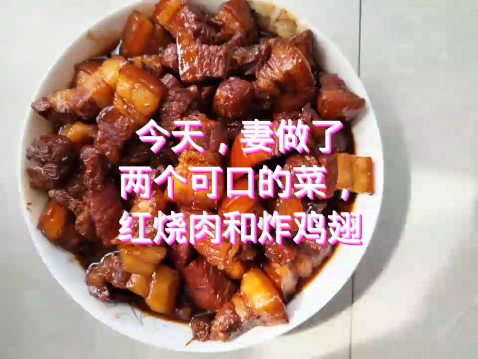 今天,妻做了 两个可口的菜, 红烧肉和炸鸡翅!