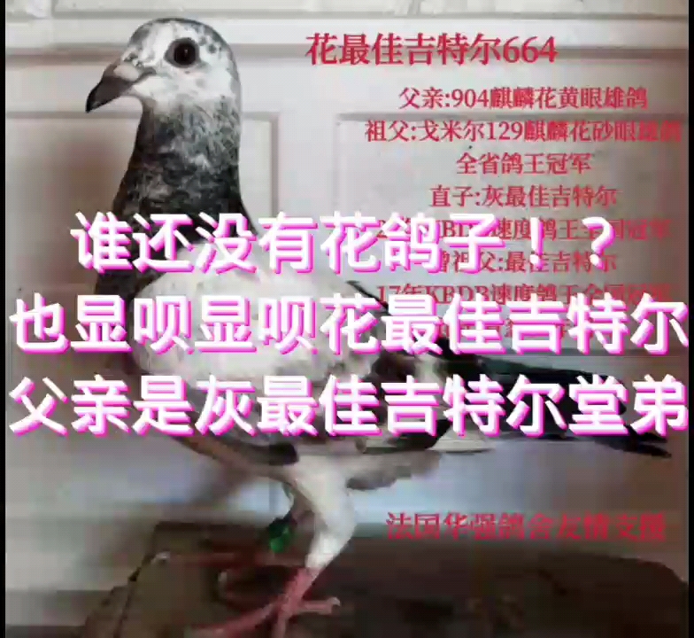 谁还没有花鸽子!? 也显呗显呗花最佳吉特尔 父亲是灰最佳吉特尔堂弟 灰最佳吉特尔, 21年KBDB速度歌王全国冠军。 祖父:戈米克129麒麟花,沙眼,雄鸽。 省赛歌王冠军,全国15位。 祖母:青葱少年的同窝。 青葱少年获得18年KBDB速度歌王全国冠军。