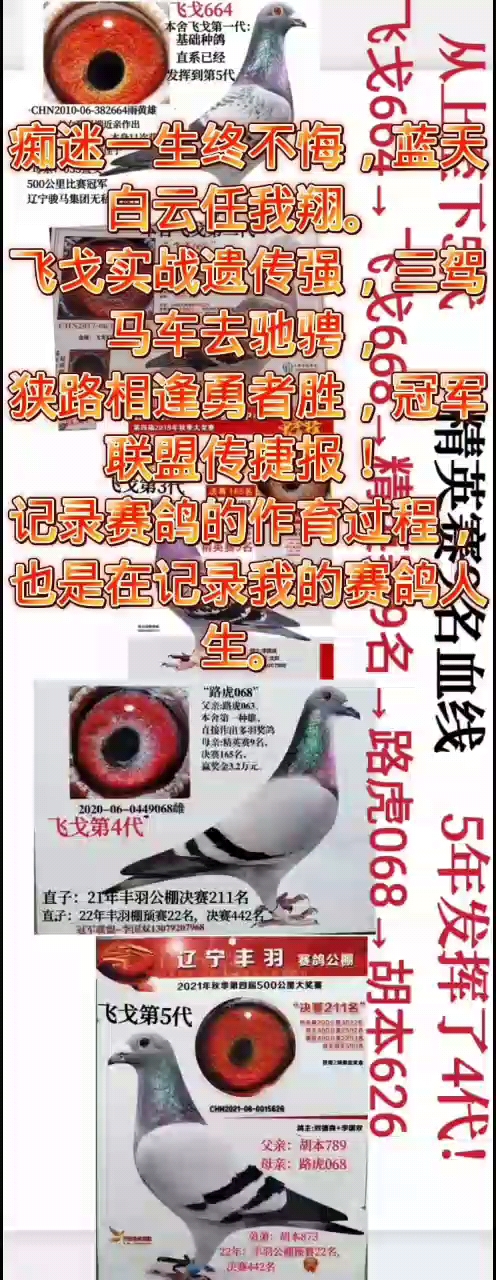 痴迷一生终不悔,蓝天白云任我翔。 飞戈实战遗传强,三驾马车去驰骋, 狭路相逢勇者胜,冠军联盟传捷报! 记录赛鸽的作育过程,也是在记录我的赛鸽人生。