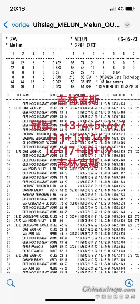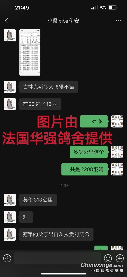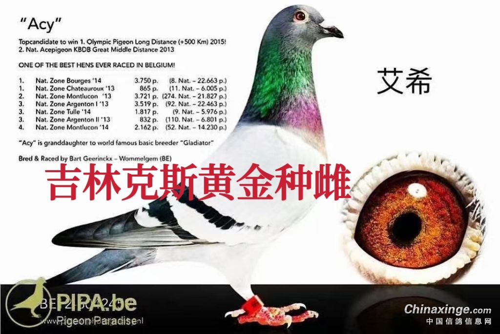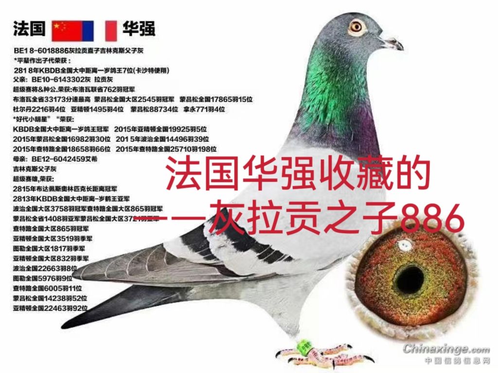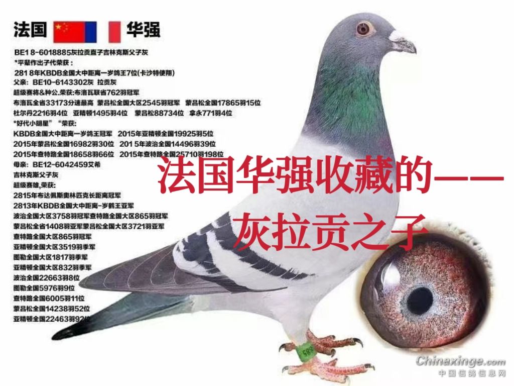 吉林克斯,又一次大获全胜,在300公里莫伦的比赛,2000多羽前20名进奖13羽! 获得:1、3、4、5、6、7、11、13、14、15、17、18、19名! 前20名狂揽13个席位,梦幼联队,超级发挥。 冠军鸽出自灰拉贡配艾希直子! 注:图片由法国华强提供。